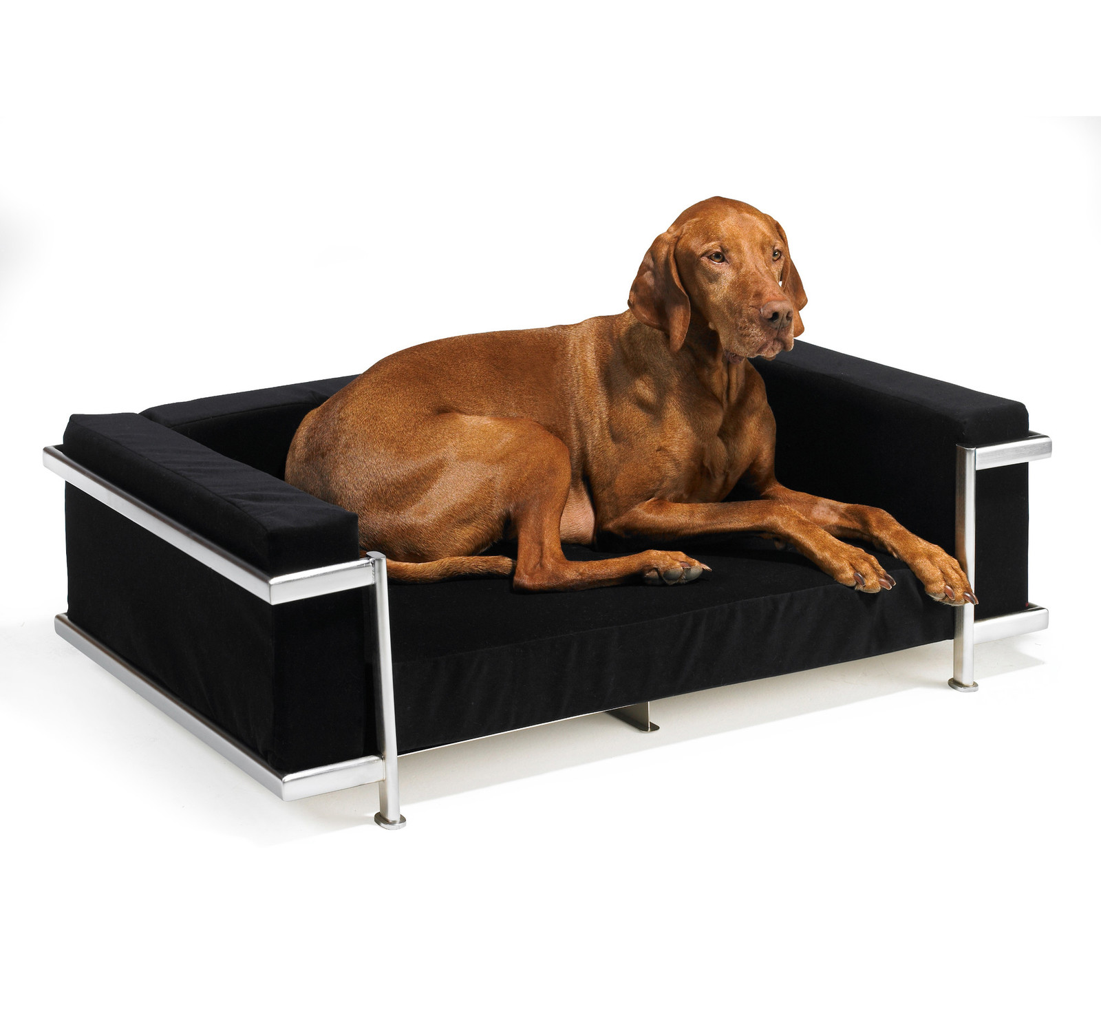 Con una construcción de acero hecha a mano que hace eco del diseño de la silla LC2 de Le Corbusier, esta cama para perro de Bowsers se verá como en casa en un interior modernista.