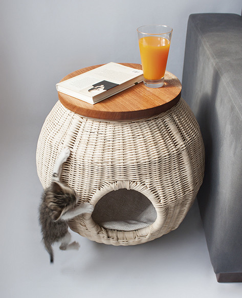 Diseñada por Laia Fuste, esta construcción de mimbre es una parte mesa auxiliar y una parte de colgador para gatitos, perfecta para compartir un rato de calidad con tu gato.
