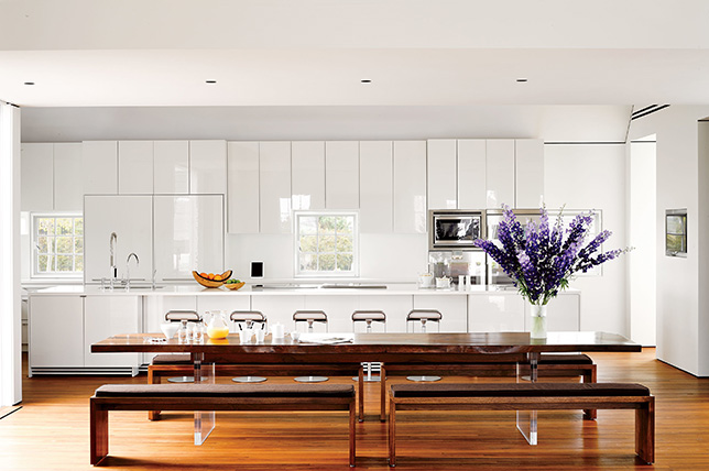 Nos encanta cómo la mesa de madera sobredimensionada da a la habitación una sensación de decadencia que mantiene la vista en movimiento, ya que una mesa más moderna excitaría mucho menos la vista y te dejaría sin conocimiento de todos y cada uno de los detalles.