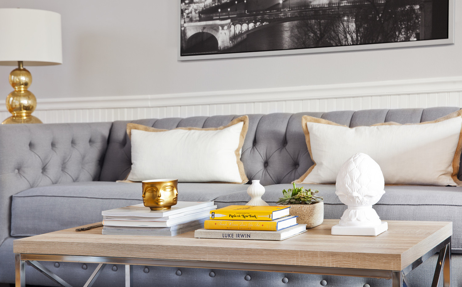 Antes de hacer cualquier otra cosa, limpia y purga cualquier artículo no esencial. Ciertamente hay excepciones a la regla, pero en general, menos es más. Por ejemplo, parece más deliberado y reflexivo mostrar algunas piezas especiales, como un jarrón y un objeto escultural, que cubrir la superficie de tu mesa de café con un montón de tchotchkes.