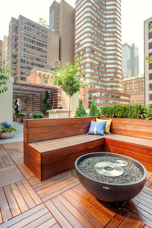 Consejo profesional: Si no estás seguro de qué hacer con tu espacio exterior, entonces considera un pequeño fogón. Colócalo alrededor de los muebles del patio como si fuera una mesa de café en tu sala de estar. Para equilibrar los elementos angulares de este espacio para el patio en el tejado, hemos seleccionado un fogón circular de piedra.