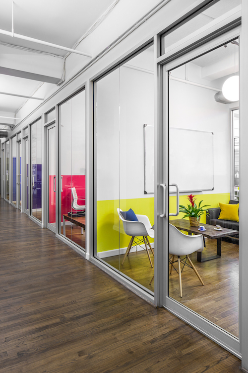 Sólo porque esté trabajando no significa que el espacio de su oficina tenga que ser aburrido o incoloro. De hecho, los estudios han demostrado que los chasquidos de colores brillantes mejoran el estado de ánimo y la productividad. Para diferenciar entre las salas de reuniones en este dinámico inicio técnico, coloreamos la coordinación de cada uno de los espacios de reunión.
