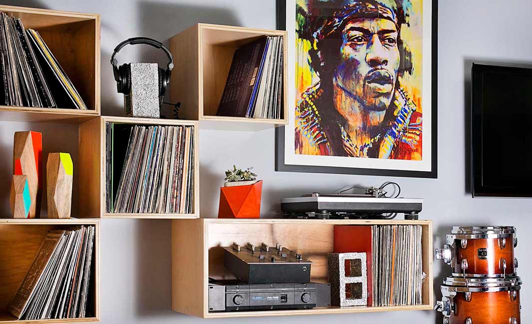 Su decoración debe reflejar su industria y la cultura de la empresa. Así que cuando Sweetsounds Studio se acercó a nosotros, decoramos su oficina con discos, tocadiscos y un póster gráfico de Jimi Hendrix.