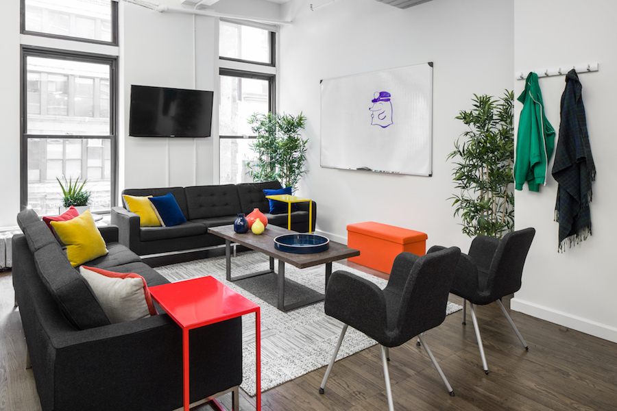Tu oficina debe ser tan cómoda y acogedora como tu casa. No tienes que elegir un montón de sillas de tipo «beanbag» y camas de día, pero considera cómodos sofás y alfombras de área para tu vestíbulo. Echa un vistazo al acogedor y hogareño diseño que le dimos a este vestíbulo del SoHo.
