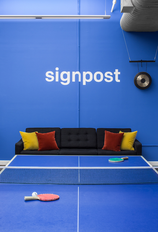 Sí, tu oficina es principalmente un espacio de trabajo, pero también debe ser un espacio donde tus empleados se sientan cómodos después de un largo día y se diviertan un poco. El diseño de la oficina de Signpost incluye una mesa de ping-pong con los colores de la empresa.