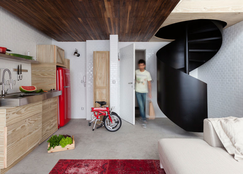 El arquitecto brasileño Alan Chu maximizó el espacio y la capacidad de almacenamiento en este apartamento de Sao Paulo con una brillante pared de almacenamiento incorporado.