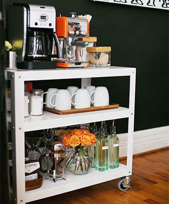 No nos malinterprete, cuando se hace de la manera correcta o perfectamente puesta en escena los carros de bar pueden ser una adición visualmente impresionante a su hogar, pero no ofrecen mucha funcionalidad para el uso diario. En lugar de ser algo que se usa todos los días, los carritos de bar tienden a ocupar espacio que podría utilizar de otras maneras. Si no quiere separar su carrito de bar, una excelente idea de reutilización es usarlo como un carrito de café, que es algo que probablemente utilice todos los días.