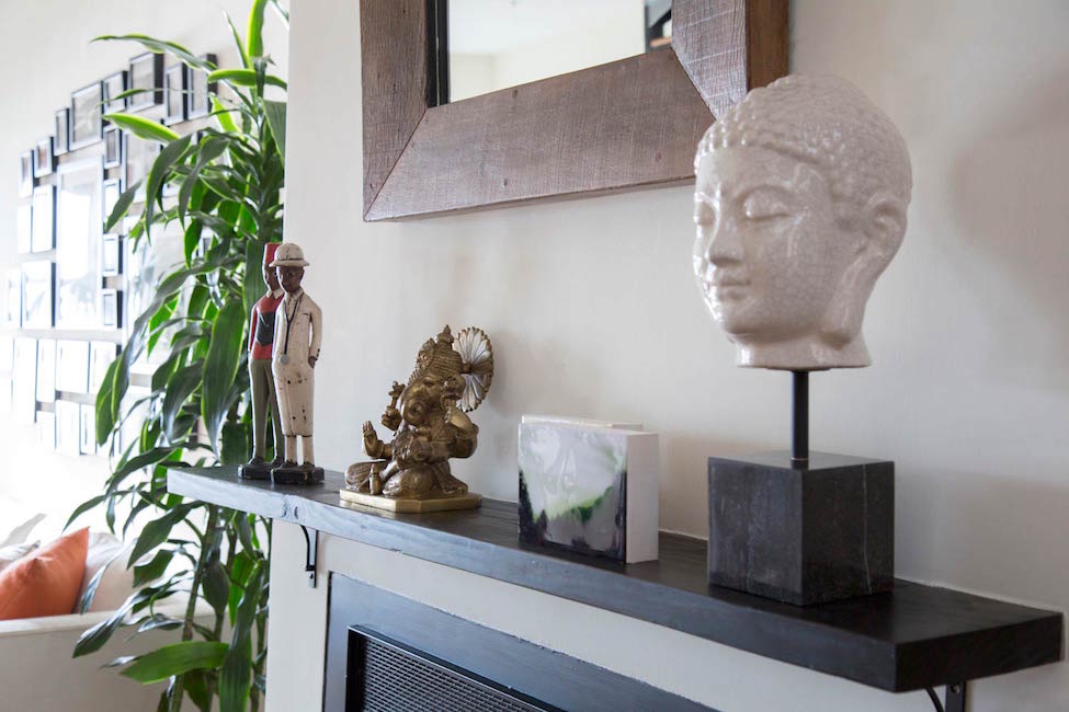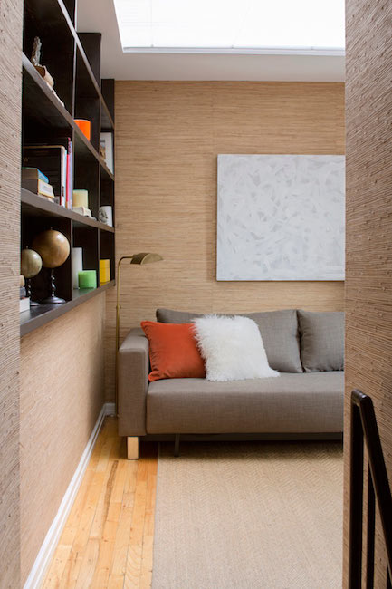 Reemplazamos el sofá por una cama para los huéspedes de la noche, actualizamos la iluminación, cambiamos el espejo por una pieza de arte de color claro y añadimos cojines de piel naranja y blanca para dar un calor alegre. Quitando las ventanas de las persianas de bambú, la habitación se convirtió en un santuario en lugar de un armario abandonado.