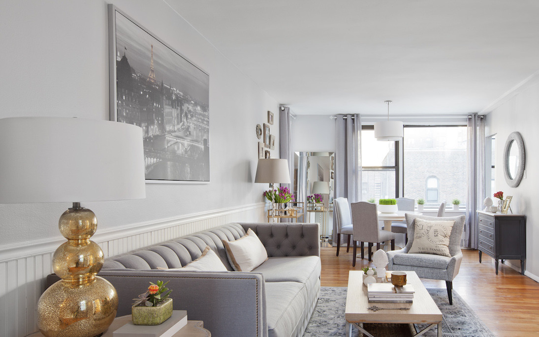 Cuando una pareja compró una cooperativa en el barrio de Turtle Bay de Manhattan, vinieron a nosotros con una petición aparentemente imposible: rediseñar un espacio poco iluminado y claustrofóbico y convertirlo en un brillante y espacioso oasis urbano. Y siempre quisieron que se hiciera con un presupuesto. Pero nuestros diseñadores senior, ansiosos como siempre, estaban listos para diseñar un espacio asequible y lujoso. Con una sutil paleta de colores neutros y brillantes acentos metálicos, minimizamos el desorden y maximizamos los elementos existentes.