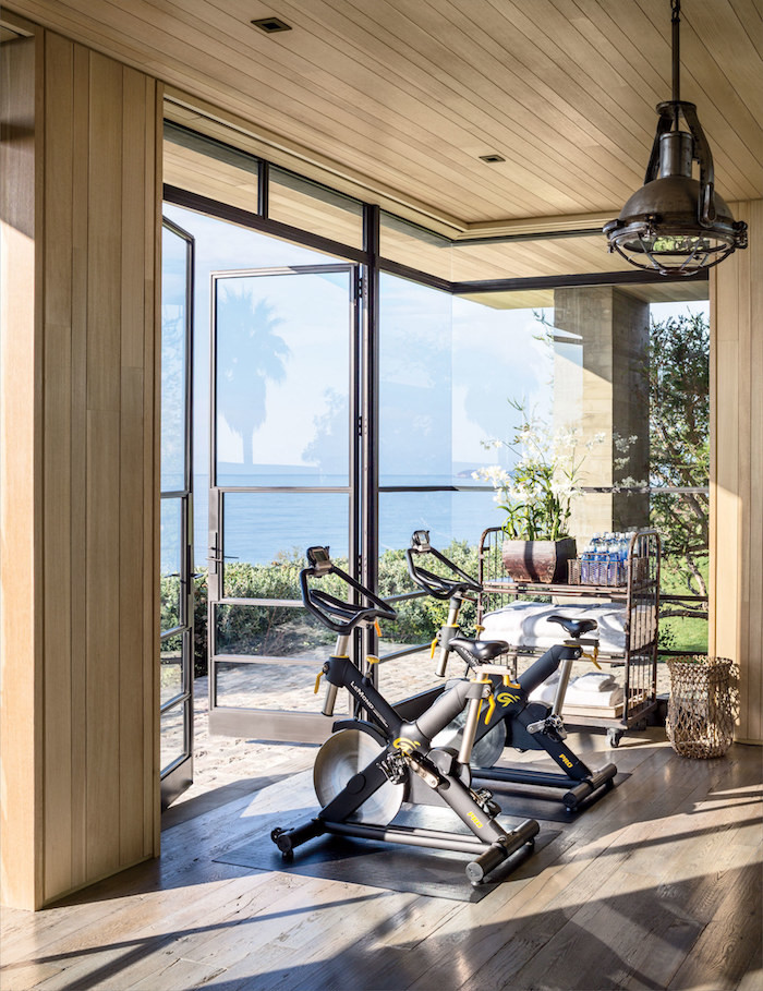 Claro, hacer ejercicio es mucho más fácil con vistas al mar como las de este gimnasio de Malibú. Una pared de vidrio con marco de acero y puertas dejan entrar al exterior. Se yuxtapusieron diferentes tablones de madera para crear un interés visual. Los robustos suelos grises se complementan con la antigua iluminación industrial. Un antiguo carro proporciona un lugar decorativo para almacenar agua, toallas y batas. Via Architectural Digest.