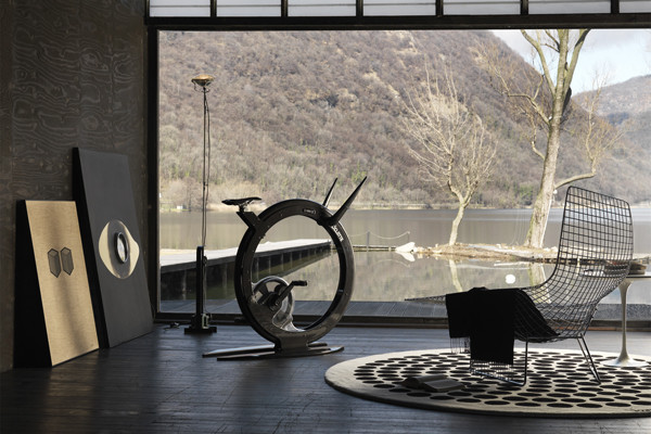 Siguiendo el ejemplo de la máquina de ejercicio, esta sala de fitness contemporánea es sobria pero hermosa. Una silla Harry Bertoia se siente como en casa en este espacio frente al mar, que se suaviza con una alfombra gráfica de área redonda y un acogedor tiro. Dos piezas de arte abstracto crean la sensación de un espacio de exhibición, mientras que una pared de madera de grano grueso proporciona una textura sutil. Via Ciclotte.