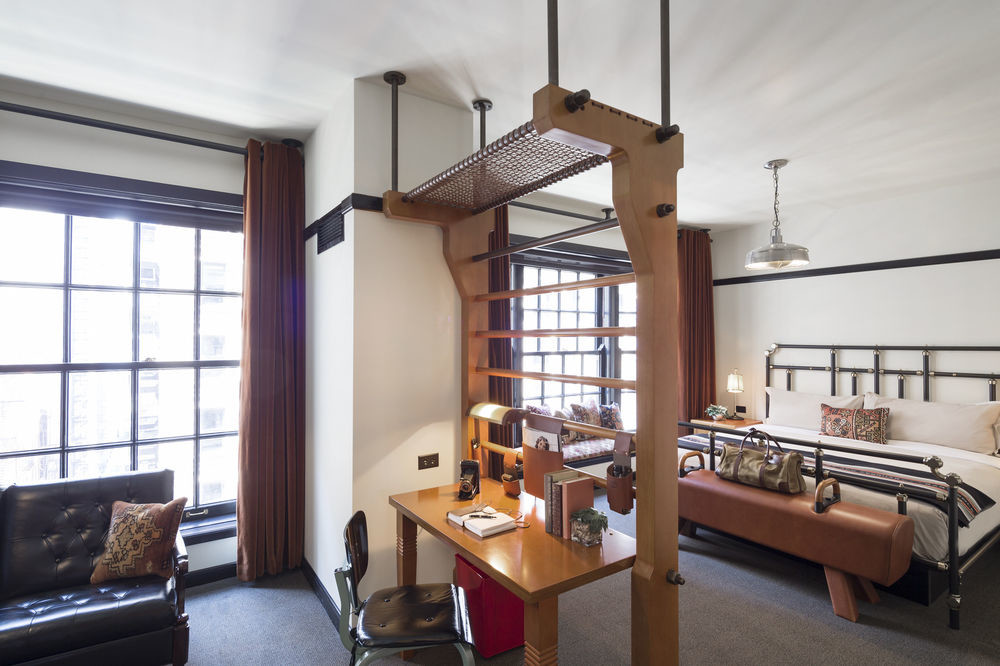 Un nuevo hotel de Chicago incorporó piezas de gimnasio antiguas en sus habitaciones para dar un toque de club de chicos.
