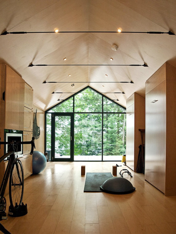 Aunque este cuarto de ejercicio es bastante estrecho, una puerta de garaje a medida lo abre a la terraza exterior. Una pared de acento de madera cálida es un buen contraste con la puerta de vidrio y acero, mientras que una foto en blanco y negro proporciona inspiración mientras se eleva el diseño. Via Zillow.