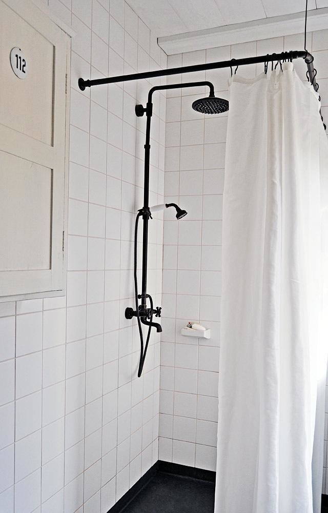 El propietario de la casa hizo la barra negra de la cortina de la ducha con viejos accesorios de metal; el techo está revestido con madera procedente del bosque circundante, protegido con una capa de pintura blanca de aceite de linaza. Via Remodelista