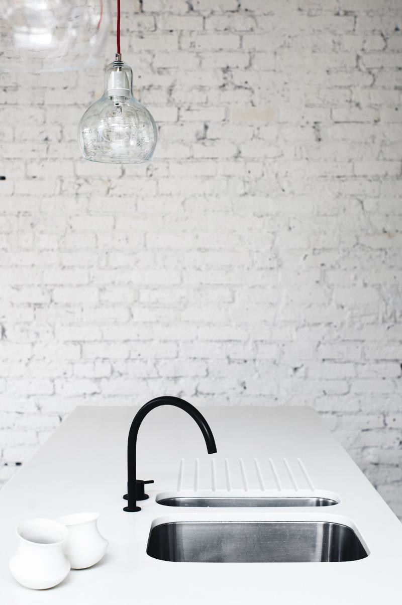 Todo se trata de la forma en esta cocina minimalista donde el grifo de cuello de cisne negro mate se roba el protagonismo. Via Inside Out
