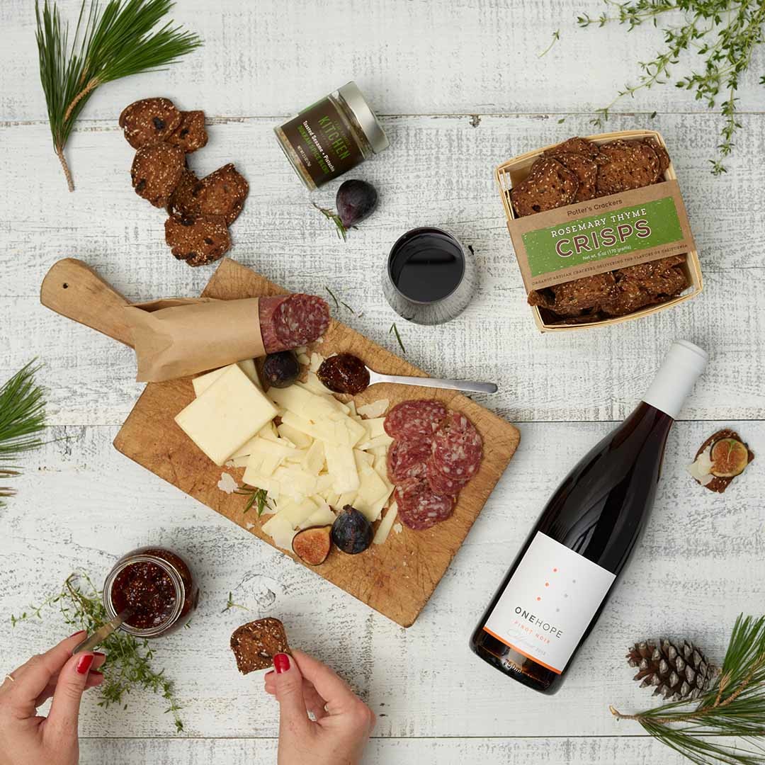 Si buscas regalar una experiencia culinaria completa, considera una caja de regalo de One Hope Winery. Su caja de regalo incluye una botella de vino tinto, patatas fritas de tomillo y romero, pasta de higo de Dalmacia, especias para mojar de la familia Clif, salami y queso suizo.