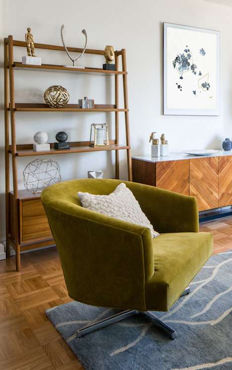 Si vas a gastar tu reembolso de impuestos en un mueble, elige algo que sea opulento, lujoso y colorido. Y nadie hace lujosos y coloridos como ABC Home. Colocamos su silla giratoria Cobble Hill Fremont en la sala de este apartamento del Upper East Side. La tela de chartreuse le da a la habitación un toque de color, mientras que complementa la vibración de mediados de siglo de la casa.