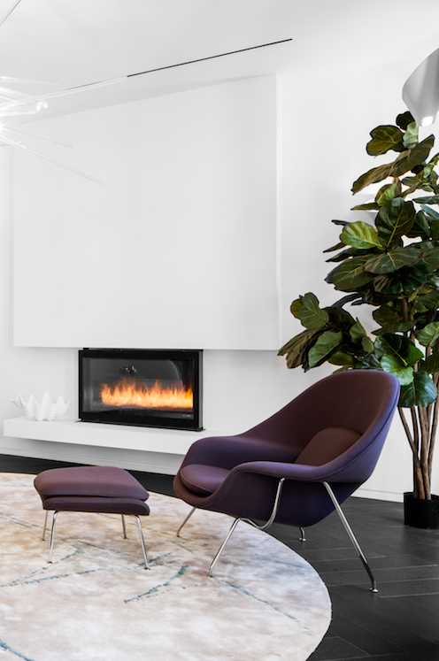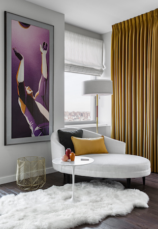 Tu sillón debe ser cálido y acogedor, sin parecer el perezoso de tu padre. La silla para el útero de Design Within Reach es la forma perfecta de aprovechar el reembolso de este año. Colocamos una en el salón de esta casa de Flatiron, y seleccionamos una tela púrpura, para un toque de color.