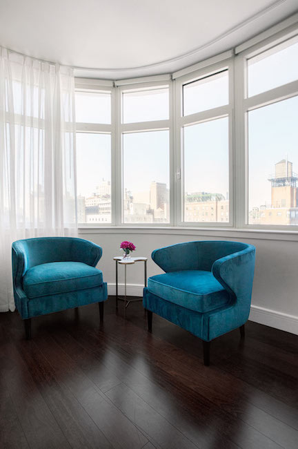 Las piezas de mobiliario en tono de joya son una de nuestras tendencias favoritas de 2017. Así que ¿por qué no gastar los fondos sobrantes de 2016 en algunos sillones de zafiro? Nos encantan estas sillas Percilla de Horchow. De hecho, nos encantan tanto que hemos colocado dos en este ligero y aireado apartamento del Upper East Side.