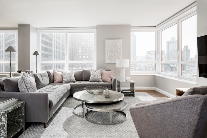 Si vas a soplar tu reembolso de impuestos en un mueble, asegúrate de que sea una pieza que se destaque y tome el centro de atención. Para una mesa de café con un lujoso acabado en madera y una base de cromo de alto brillo, considera este juego de mesas de cóctel de Interlude Home. Hemos colocado un conjunto en la sala de este condominio de lujo personalizado en el Upper East Side. Una forma circular es el perfecto contrapeso a los muebles angulares, y también complementa el ambiente chic y lujoso del condominio.