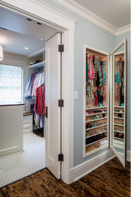 En este armario, se construye un espacio para las joyas detrás de un espejo abatible, muy parecido a un botiquín pero a mayor escala.
