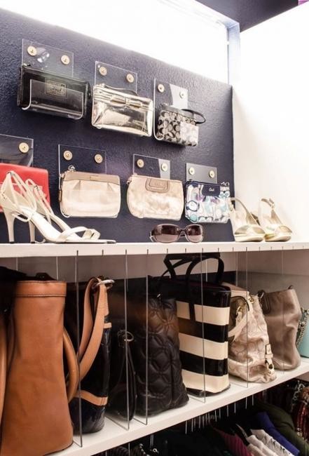 Cuando no estés usando tus bolsos favoritos, guárdalos (y presúmelos) en contenedores de acrílico transparente montados en la pared. Separa y organiza los bolsos más grandes con divisores de estantes de acrílico.