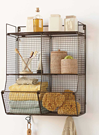 Sujeta las cestas de almacenamiento a la pared por la base, para que puedas enrollar o doblar las toallas y colocarlas en la cesta. Ve por cestas de diferentes tamaños y escalas para que puedas almacenar fácilmente artículos más pequeños y más grandes por igual.
