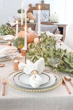 El día de Acción de Gracias es un día festivo que parece traer mucho calor a su hogar. Para contrastar las piezas más tradicionales que planea poner en su mesa, nuestros diseñadores de interiores recomiendan buscar cubiertos de oro rosa. El oro rosa aportará calidez y glamour a tu mesa, pero no chocará con ninguna de las piezas que ya existen. Prepara tu mejor vajilla si quieres quedarte con los cubiertos que ya tienes en casa. Esto ayudará a que la fiesta y la cena se sientan muy especiales. Pulir los cubiertos y afilar los cuchillos es un gran proyecto de decoración para el Día de Acción de Gracias que querrás hacer en los días previos a la gran cena. Así te asegurarás de que nadie tenga que esperar a que el pavo sea cortado.