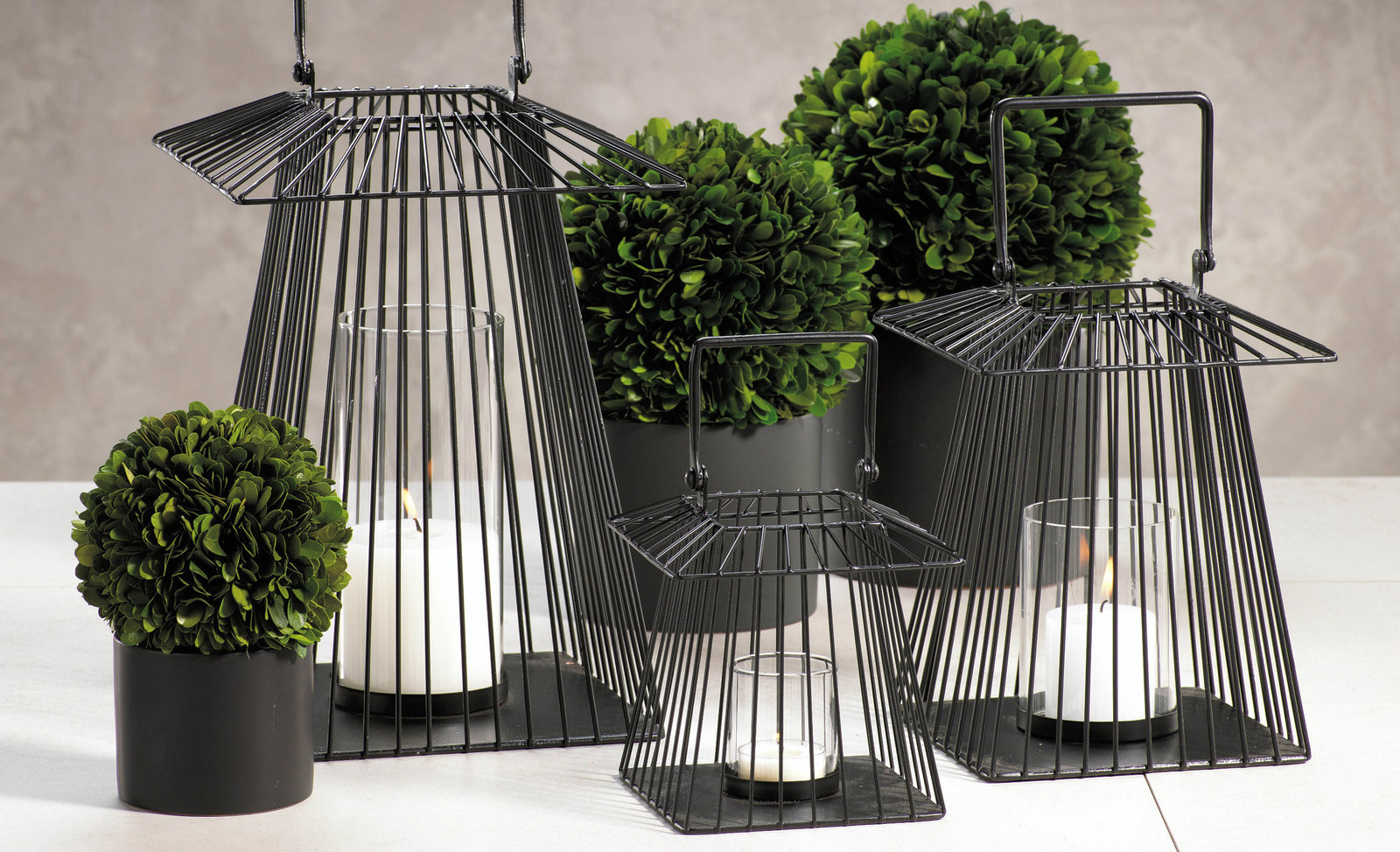 Elegantes y sofisticadas, estas linternas de jardín metálicas negras pertenecen a un elegante patio urbano en la azotea o a un moderno patio junto a la piscina. Una vez que caiga la noche, la luz de las velas debe arrojar un interesante resplandor a través de las finas barras de metal.