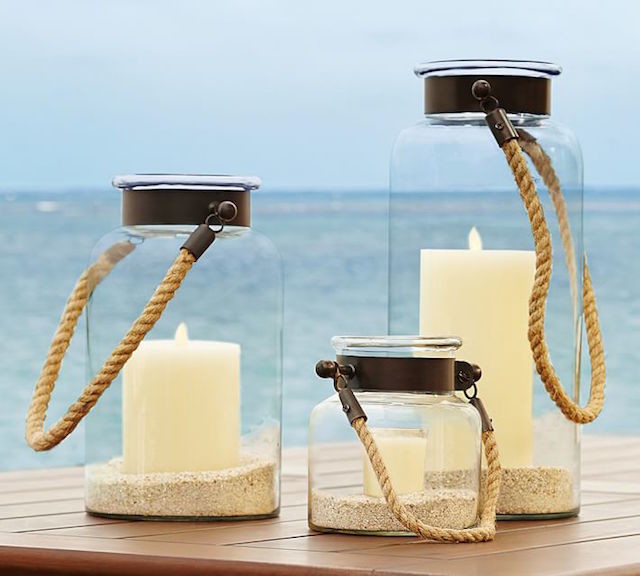 Estas linternas de playa, de vidrio soplado, tienen una refinada vibración rústica con su acabado de bronce y sus mangos de cuerda. Se verían bien en casa en una mesa de picnic en el patio trasero o en el patio de una casa de campo en el lago.