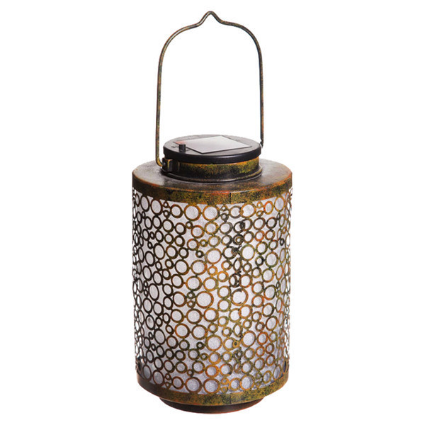 La mejor manera de evitar que las velas de las linternas se apaguen en días de viento? Esta linterna de metal dorado tiene un intrincado revestimiento calado y, una vez que la bombilla solar se carga durante el día, proyecta un magnífico patrón en su mesa de exterior.