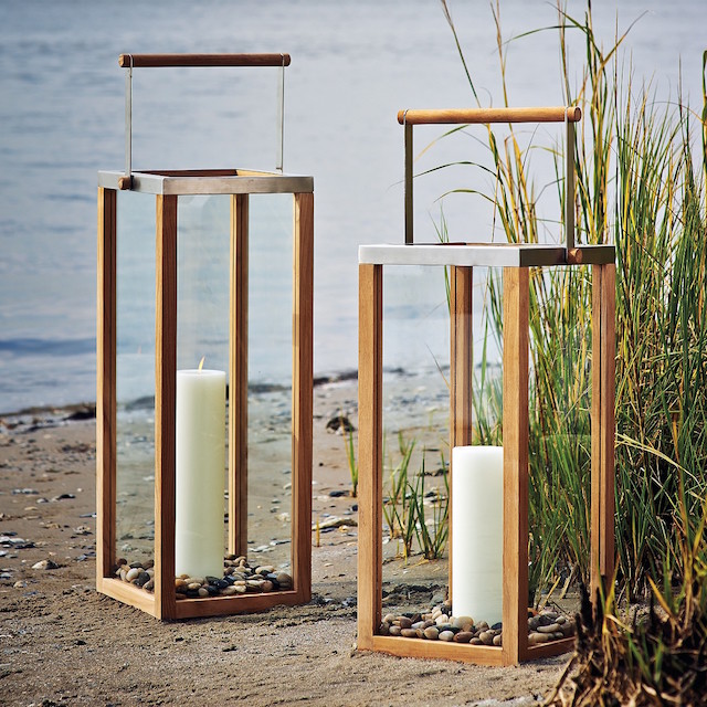 Las líneas limpias y el diseño mínimo de esta linterna de té y acero inoxidable la convierten en una elección natural para casas de playa y casas de vacaciones con una sensibilidad contemporánea. Los paneles de cristal en los laterales mantendrán las llamas brillantes, y un agujero de drenaje en la esquina inferior la mantendrá seca.