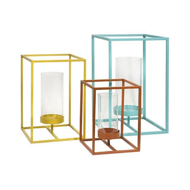 Para una toma decididamente diferente del aspecto tradicional, echa un vistazo a este juego arquitectónico de linternas con marco de metal. El diseño arquitectónico las hace un poco más altas que las linternas típicas, pero los colores vibrantes mantienen el aspecto divertido y juguetón para una decoración moderna y familiar.