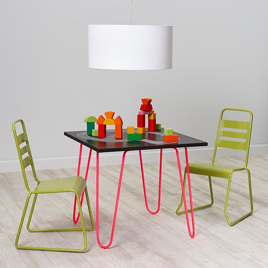 La mesa de pizarra de Land of Nod combina una forma simple con patas de horquilla de color neón para un look retro-cool.