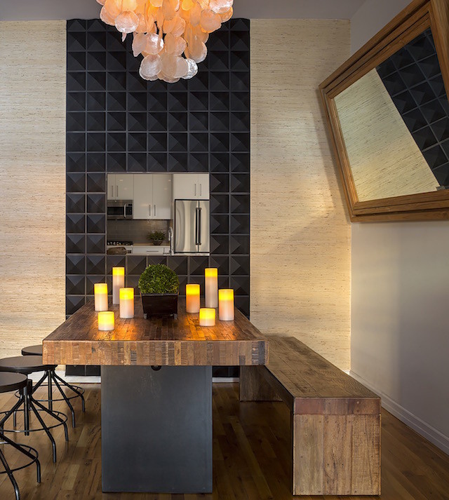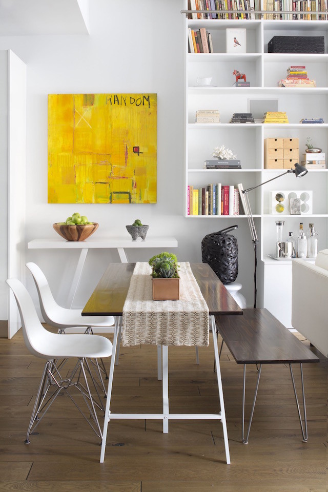 En lugar de un juego uniforme de sillas, mezcla las cosas con un banco en uno de los lados como hicieron nuestros diseñadores para un home staging. Las piezas no tienen por qué coincidir exactamente, pero para un aspecto más aerodinámico, apuesta por piezas que tengan la misma silueta.