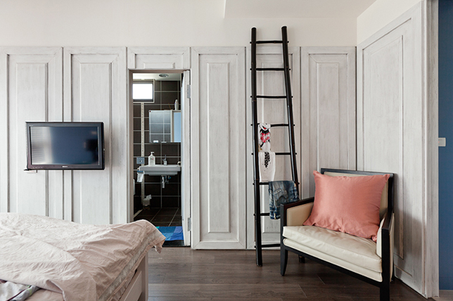 Las escaleras inclinadas son excelentes ideas para la decoración de pequeños dormitorios para guardar ropa, bolsos y cinturones usados recientemente, especialmente para piezas a las que no necesariamente quieres dar espacio en el armario en el diseño de tu pequeño dormitorio.