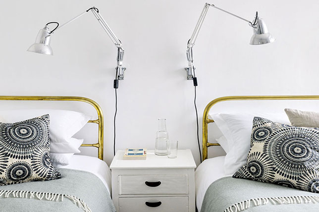 Las lámparas de mesa pueden ocupar mucho espacio innecesario en un diseño de dormitorio pequeño, pero tener un accesorio de iluminación de pared en un brazo oscilante que se pueda mover fácilmente, es una solución de decorador.