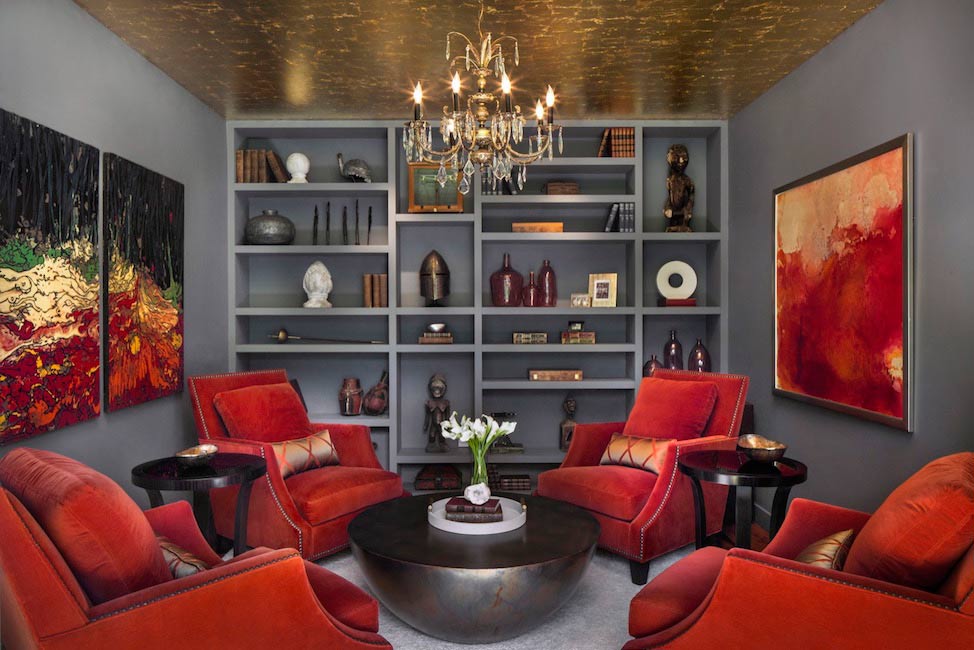 Y si no tienes espacio para añadir una pieza de acento, entonces considera dar un retoque a tu techo. En esta finca de Greenwich, añadimos un techo dorado a la biblioteca. Ilumina el espacio y añade un acento dramático sin ocupar ningún espacio extra.