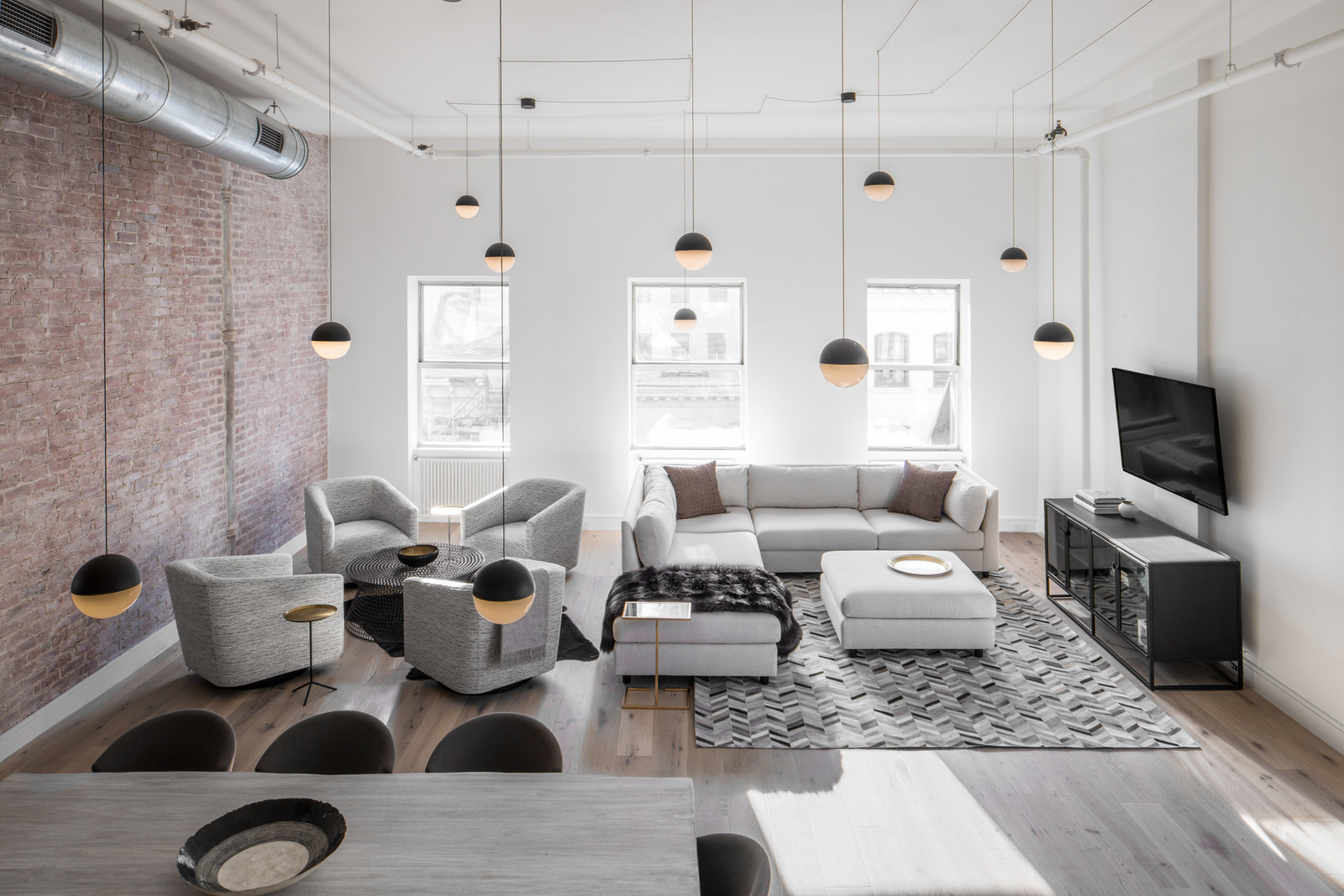 Cuando coloque piezas de acento en su casa, piense en vertical. Las lámparas colgantes en este loft TriBeCa son un acento increíble porque coinciden con el aspecto rústico-chic del espacio y tienen un efecto llamativo.