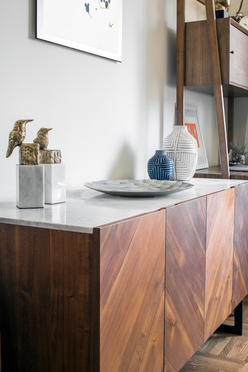 ¿Quién dice que las piezas de acento no pueden ser funcionales? Nos encanta la consola de madera de teca maciza de este lujoso condominio del Upper East Side. No sólo le da a esta familia de cuatro personas algo de espacio de almacenamiento adicional, sino que también añade un acento de lujo a su sala de estar de mediados de siglo.