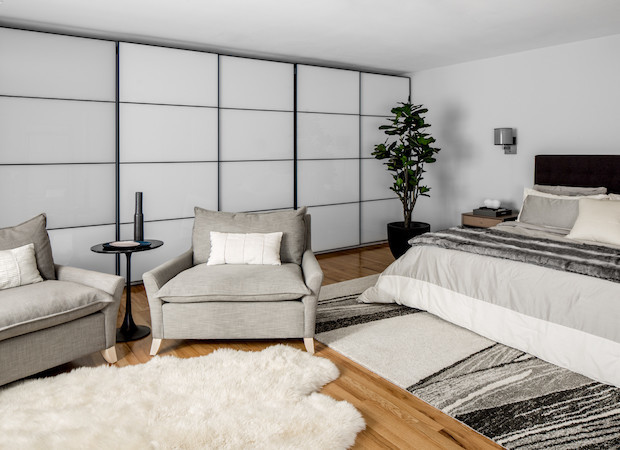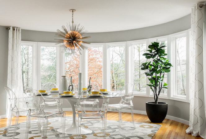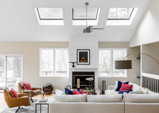 Con una arboleda que bordea la propiedad, enmarcamos las ventanas con tratamientos blancos, para atraer la mirada hacia la naturaleza, y acentuando la arquitectura angular de la casa.