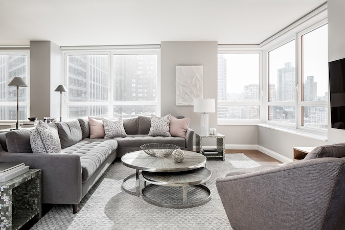 Encontrar la alfombra de área proporcional es el primer paso para amueblar cualquier habitación. Si estás intentando refrescar tu apartamento, entonces prueba a jugar con diferentes combinaciones de alfombras. Cambia la alfombra de tu dormitorio por la de tu sala de estar y mira qué se pega. O prueba a desplazar una alfombra de área 90 grados y reorganizar la disposición de tus muebles. Mira cómo colocamos este sofá seccional y la mesa de centro en este condominio de lujo del Upper East Side.