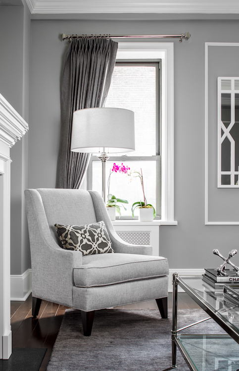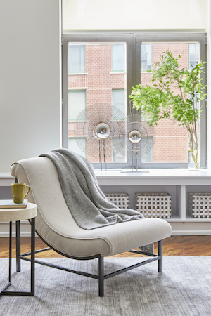 Con cualquier rediseño de la casa, considera la forma de tus muebles existentes, y asegúrate de mantener un equilibrio entre las piezas angulares y curvas. Para equilibrar la mesa de café rectangular y el sofá en esta propiedad de inversión TriBeCa, conseguimos la silla Maurice de CFC.