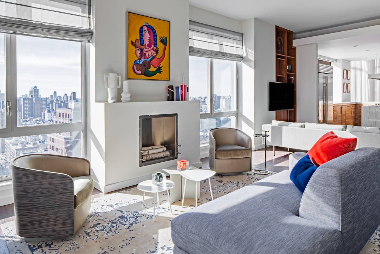 Los sillones son una gran manera de añadir un toque de color a su sala de estar. Y esta temporada, las piezas de mobiliario en tono de joya están definitivamente de moda. Echa un vistazo al dúo de sillones de zafiro que conseguimos en Horchow para este luminoso apartamento de gran altura.