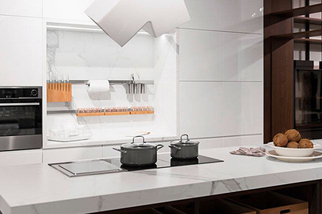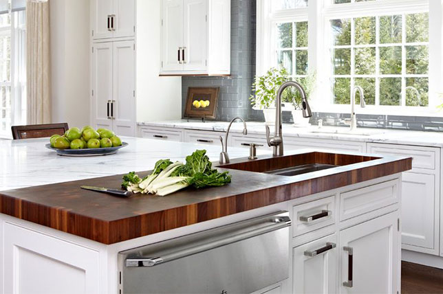 No hay nada malo con la altura media del mostrador, que es genial para esas preparaciones casuales de comidas diarias, sin embargo, cuando se prepara y se cocina para eventos especiales y más gente de lo habitual, el espacio del mostrador puede ser limitado. Así que si es el momento de hacer espacio en su cocina considere seguir la última tendencia de diseño interior de cocinas y añada una estación de corte dedicada en su cocina. El mármol en el puesto de corte facilitará la integración con las superficies existentes, ya sea como complemento o como contraste. Estas ubicaciones dedicadas tienden a ser más bajas que las otras superficies, pero nuestros diseñadores dicen que no hay ninguna regla para esto, aparte de asegurarse de que su altura es la adecuada para usted y eficiente: AKDO