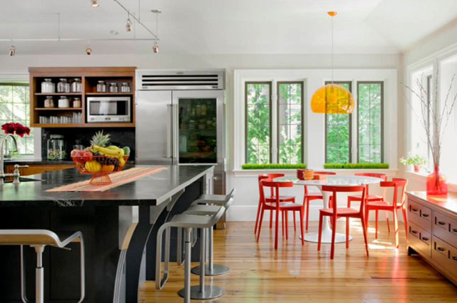 Las islas de cocina son una idea de diseño de cocina simple que es genial para añadir espacio en el mostrador en el corazón de su casa, y a pesar de su popularidad, muchos propietarios y diseñadores están optando por colocar mesas de comedor en una cocina, especialmente aquellos con asientos limitados. En comparación con las islas, una mesa de comedor hace que la comida sea más íntima y da a todos la oportunidad de ser parte de la conversación de la cena. ¿Qué tan atractiva puede ser la conversación si todos están mirando en la misma dirección? Las mesas de comedor pueden servir también como espacio de mostrador y serán más atractivas para sus invitados: Homedit
